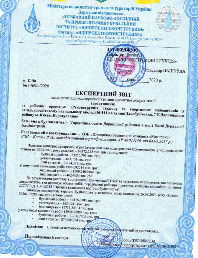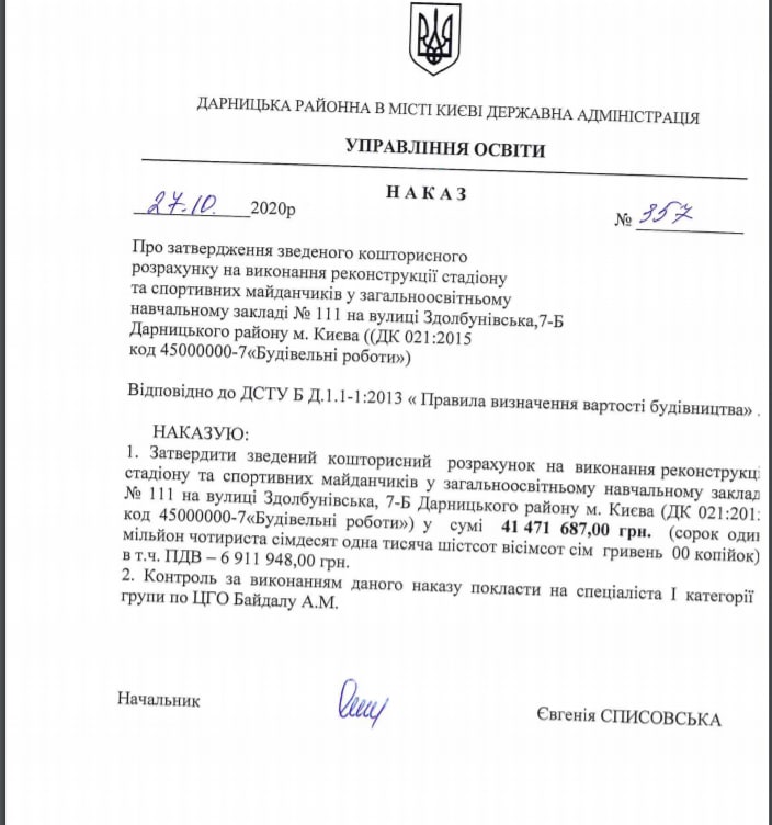 В системе ProZorro опубликован экспертный отчет от 26 августа 2020 года, согласно которому общая сметная стоимость реконструкции стадиона и спортплощадок школы №111 в ценах на август 2020 года составила 57,88 млн гривен. Однако фактически за неделю до подписания договора с ООО “СВП Мастер”, управление образования Дарницкой РГА своим приказом №357 от 27 октября 2020 года утвердило сметную стоимость этой реконструкции в размере 41,47 млн гривен.
