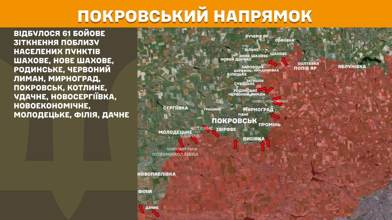 Згідно повідомлення, на Покровському напрямку відбулося 61 бойове зіткнення поблизу населених пунктів Шахове, Нове Шахове, Родинське, Червоний Лиман, Мирноград, Покровськ, Котлине, Удачне, Новосергіївка, Новоекономічне, Молодецьке, Філія, Дачне.