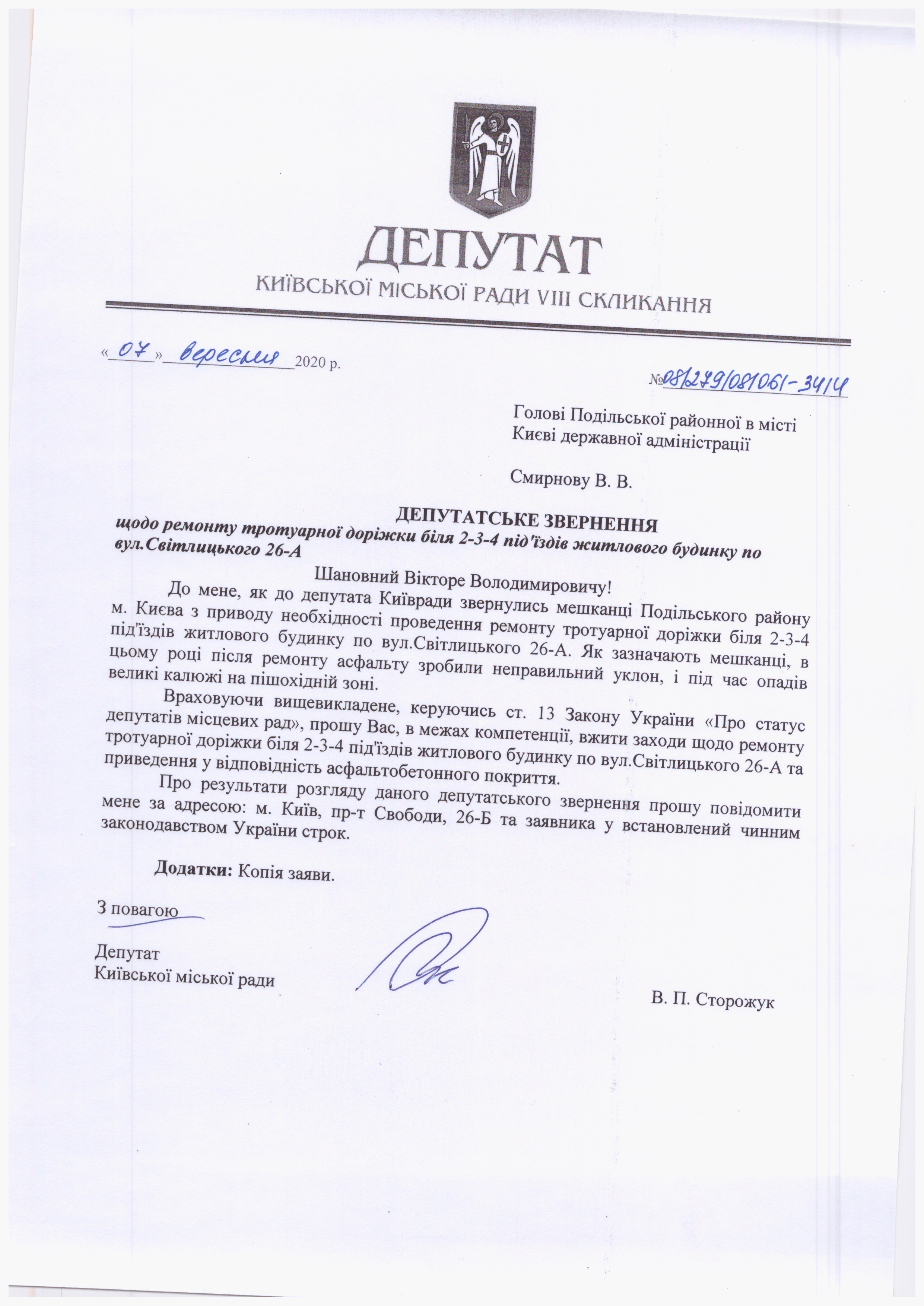 Глава комиссии Киевсовета по вопросам регламента и депутатской этики Вадим Сторожук (фракция “Солидарность”) попросил главу Подольской РГА Виктора Смирнова исправить наклон недавно отремонтированной тротуарной дорожки возле 2-го, 3-го и 4-го подъездов дома по ул. Светлицкого, 26-А.