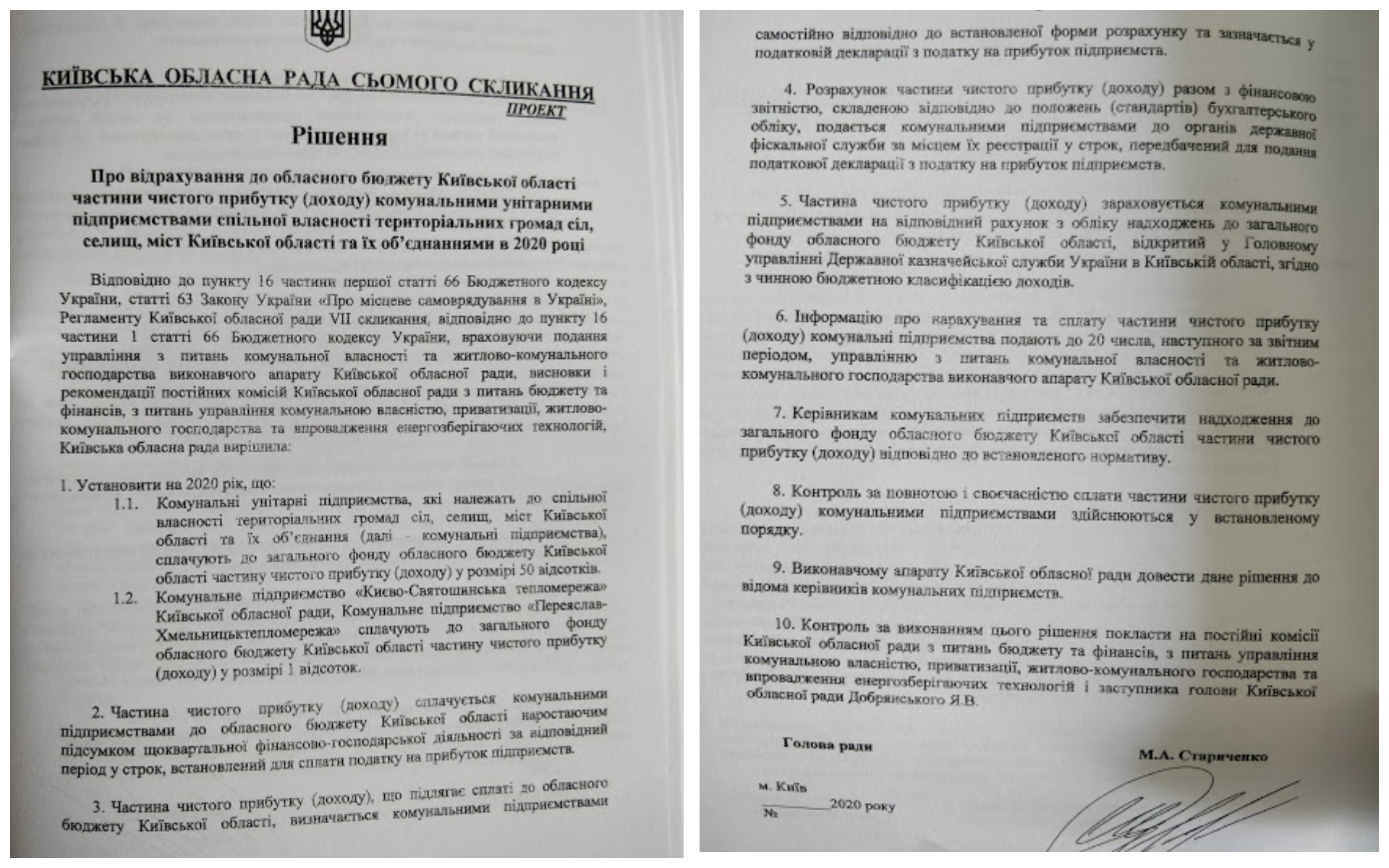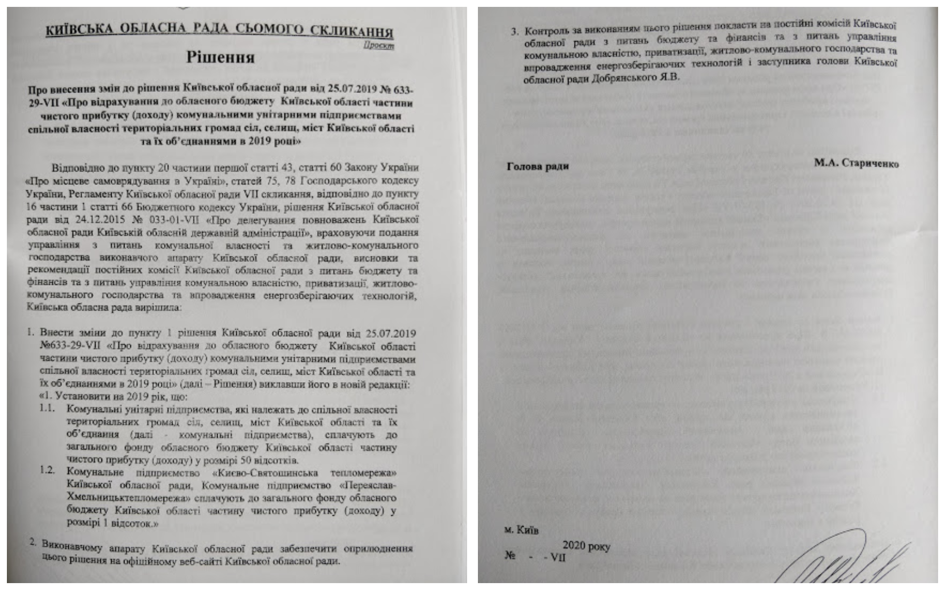 Как стало известно KV, 22 июня депутаты Киевоблсовета поддержали решение “О внесении изменений в решение КОС от 25.07.2019 года №633-29-VI “Об отчислениях в областной бюджет Киевской области части чистой прибыли коммунальными унитарными предприятиями совместной собственности территориальных общин сел, поселков, городов Киевской области и их объединениями в 2019 году” и решение “Об отчислении в областной бюджет Киевской области части чистой прибыли коммунальными унитарными предприятиями совместной собственности территориальных общин сел, поселков, городов Киевской области и их объединениями в 2020 году”.