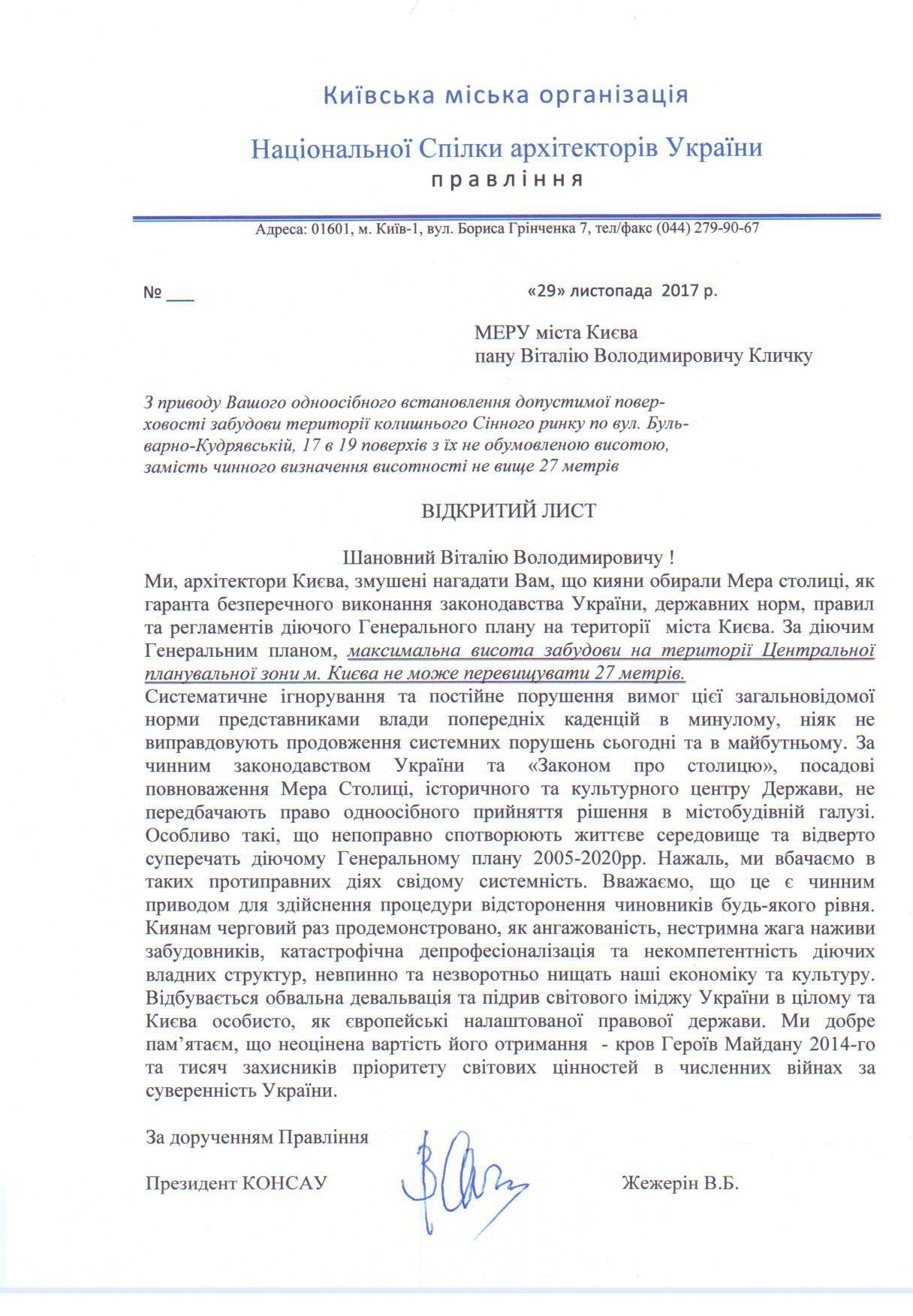 Об этом KV стало известно из открытого письма за подписью главы киевской городской организации Национального союза архитекторов Украины Вадима Жежерина мэру столицы Виталию Кличко.