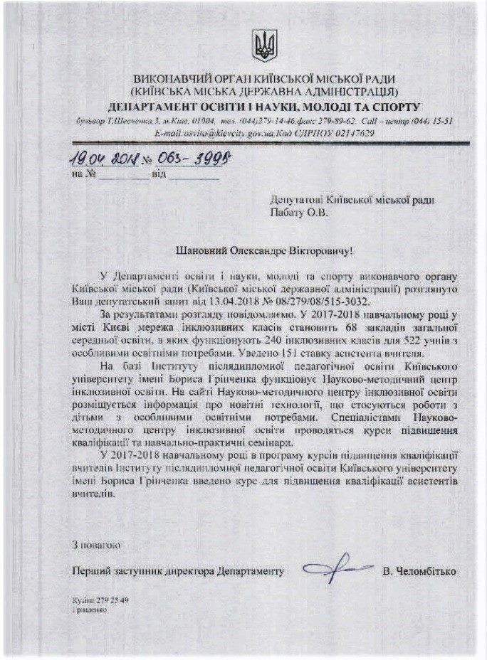 4 апреля 2018 года комиссия Киевсовета по вопросам образования, науки, семьи молодежи и спорта поддержала проект решения о создании инклюзивно-ресурсных центров образования на базе учебных заведений.