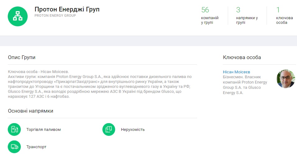Система Youcontrol относит ДП “Ардал” и ООО “Автонафта” к группе компаний Proton Energy Group, которая, в частности, владеет сетью заправок Glusco. Ключевое лицо этой группы – известный бизнесмен Нисан Моисеев.