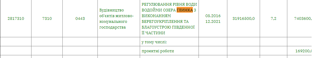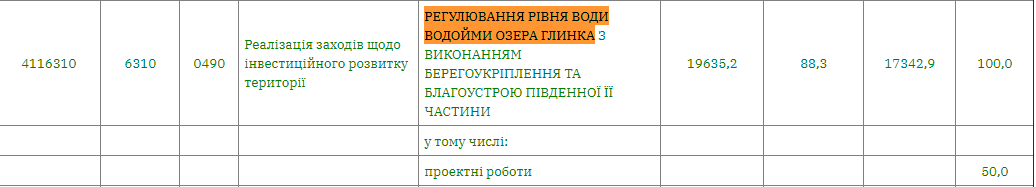 Финансирование на эти работы город выделял с 2017 года. В бюджете Киева-2017 было заложено 17,34 млн гривен, в том числе 50 тыс. гривен на проектные работы. В 2018 году средств не предусмотрели, а в 2019 году выделили 133 тыс. гривен на проектные работы. В столичном бюджете на 2020 год на работы по регулированию уровня воды озера Глинка заложили 7,4 млн гривен, в том числе на проектные работы – 169,2 тыс. гривен.