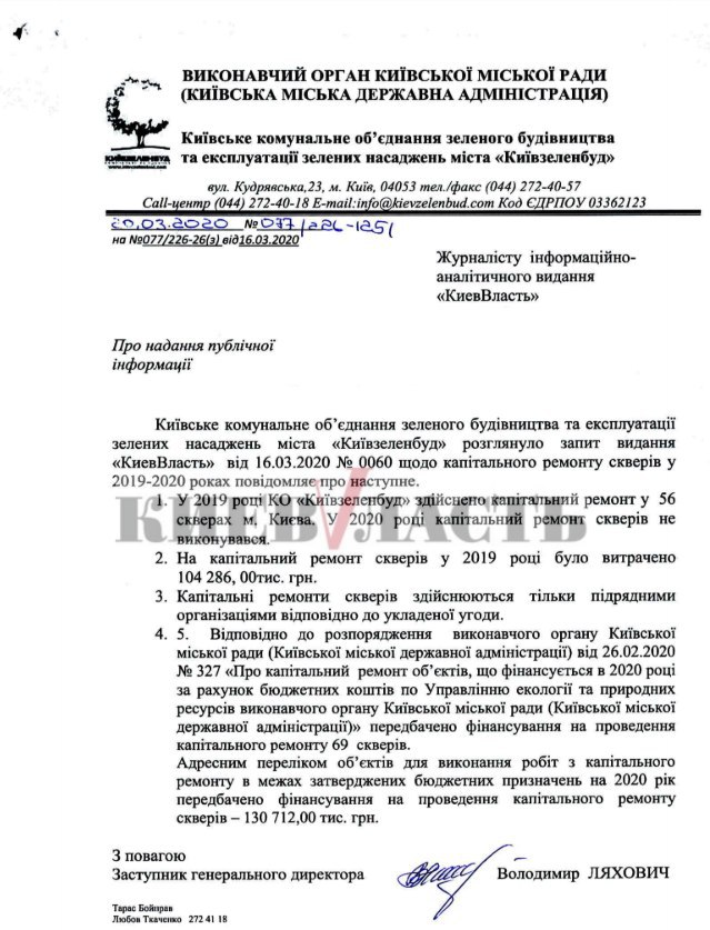 Также осенью 2019 года КО “Киевзеленстрой” в четвертый раз за последние два года заказало капитальный ремонт сквера им. Гонты на ул. Вячеслава Липинского в Шевченковском районе столицы. Тогда 6,74 млн гривен от “Киевзеленстроя” должна была получить фирма ранее проводившая капремонт в этом сквере Гонты, причем за те же самые виды работ.