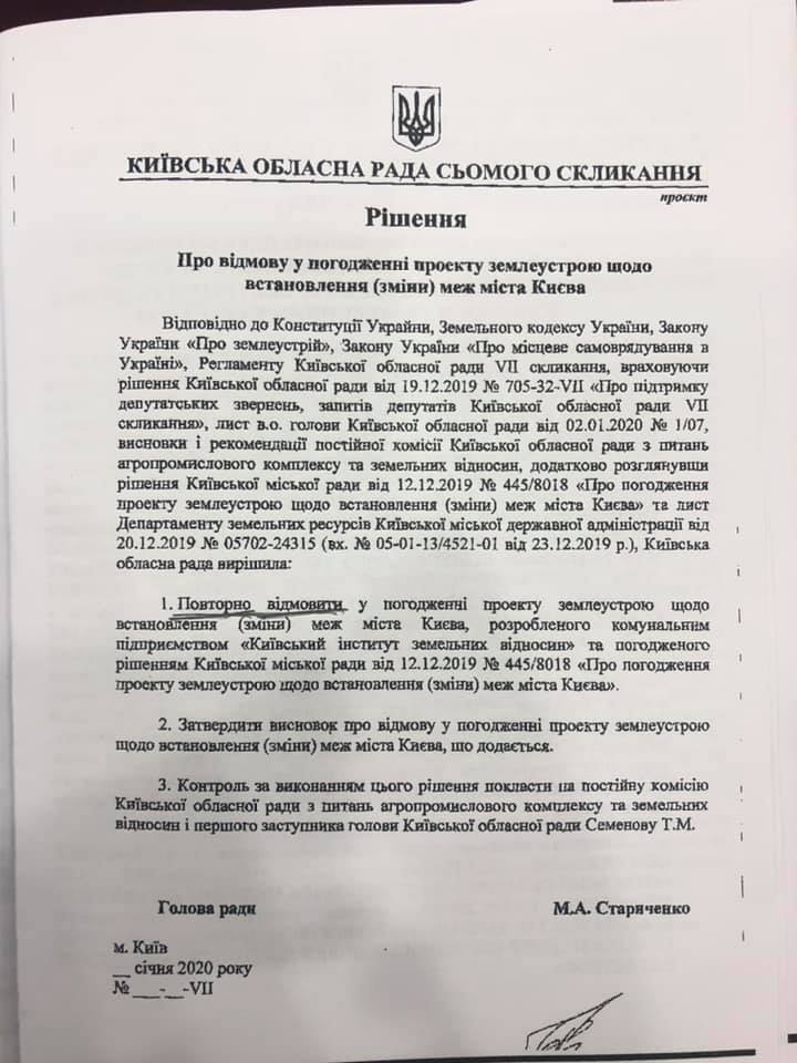 “Повторно відмовити у погодженні проекту землеустрою щодо встановлення (зміни) меж міста Києва, розробленого комунальним підприємством “Київський інститут земельних відносин” та погодженого рішенням Київської міської ради від 12.12.2019 року №445/8018 “Про погодження проекту землеустрою щодо встановлення (зміни) меж міста Києва”, – йдеться у рішенні.