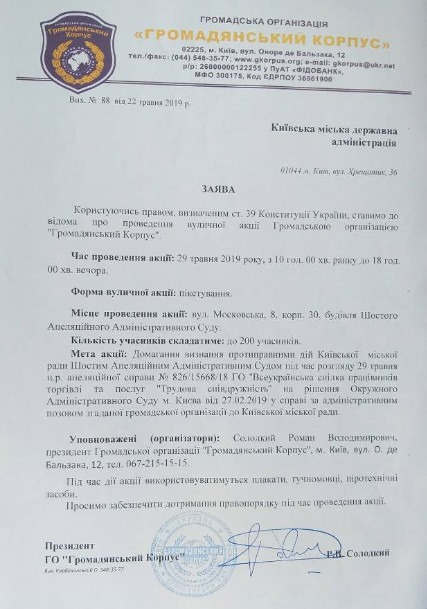 Согласно письму, участники митинга хотят признания судом противоправными действий Киевсовета по подготовке проекта решения Киевсовета о введении новых правил размещения ВС. А следовательно отмены Шестым апелляционным админсудом решения суда первой инстанции от 27 февраля 2019 года по иску Всеукраинского союза работников торговли и услуг “Трудовое содружество” к Киевсовету.