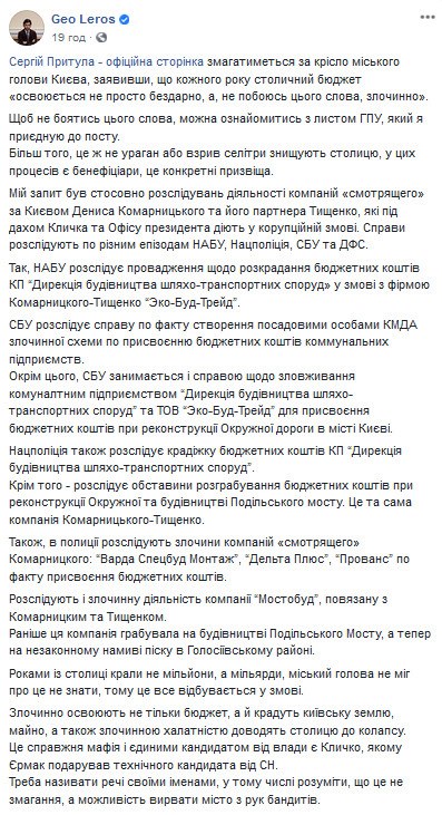 “Злочинно освоюють не тільки бюджет, а й крадуть київську землю, майно, а також злочинною халатністю доводять столицю до колапсу. Це справжня мафія і єдиними кандидатом від влади є Кличко, якому Єрмак подарував технічного кандидата від СН. Треба називати речі своїми іменами, у тому числі розуміти, що це не змагання, а можливість вирвати місто з рук бандитів”, – резюмував Гео Лєрос.