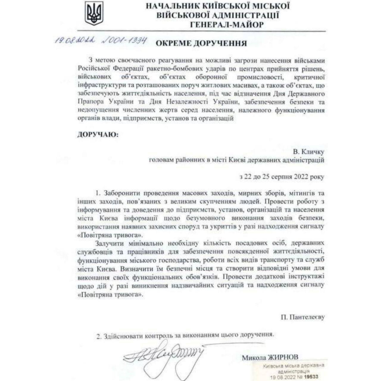 “З 22 по 22 серпня 2022 року заборонити проведення масових заходів, мирних зборів, мітингів та інших заходів, пов’язаних з великим скупченням людей. Провести роботу з інформування та доведення до підприємств, установ, організацій та населення Києва інформацію щодо безумовного виконання заходів безпеки, використання наявних захисних споруд та укриттів у разі надходження сигналу “Повітряна тривога”, – зазначено у документі.