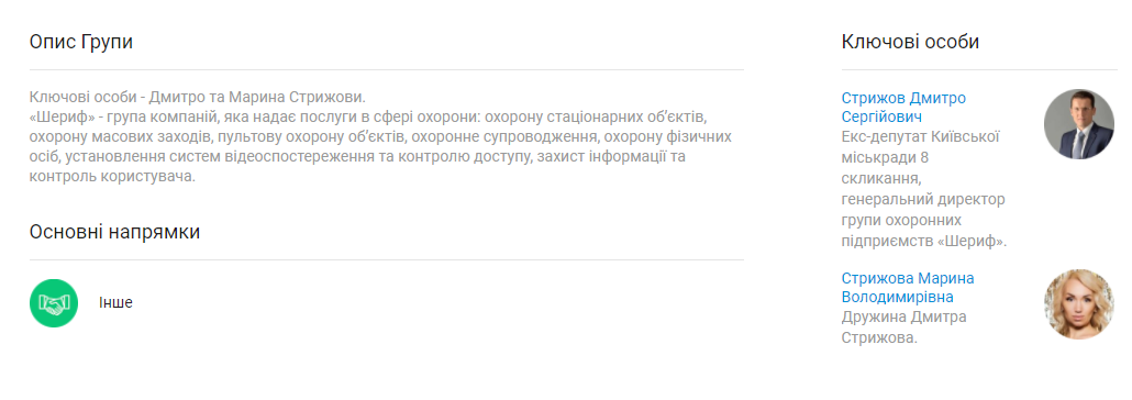 ООО “Сила защиты” входит в группу “Шериф” депутата Киевсовета VIII созыва Дмитрия Стрижова и его жены Марины Стрыжовой. Компании группы предоставляют услуги охраны стационарных объектов, массовых мероприятий и физлиц, пультовую охрану, охранное сопровождение, а также занимаются установкой систем видеонаблюдения и контроля доступа.