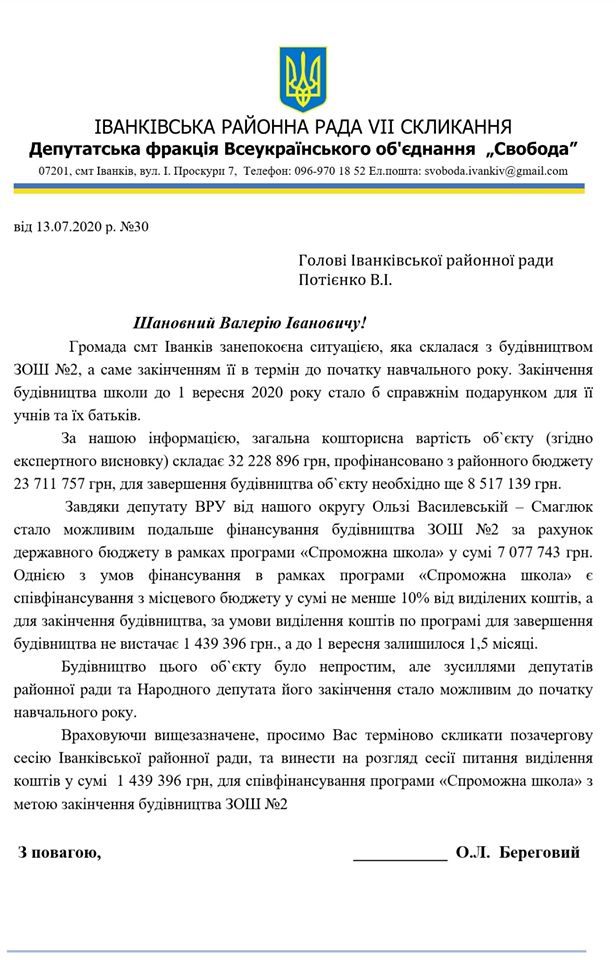 Депутат повідомив, що 13 липня 2020 року зареєстрував звернення до Іванківської райради з проханням скликати позачергову сесію щодо виділення зазначених коштів для завершення будівництва школи.