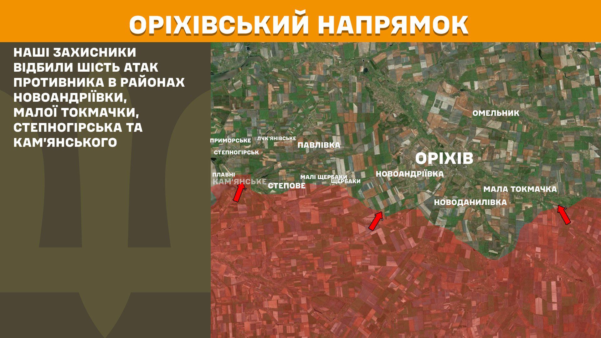 На Оріхівському напрямку наші захисники відбили шість атак противника в районах Новоандріївки, Малої Токмачки, Степногірська та Кам’янського.