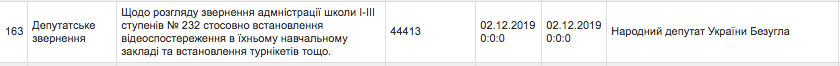 Согласно одному из обращений, нардеп интересуется у столичной власти вопросом рассмотрения обращения администрации школы I-III степени № 232 касательно установки видеонаблюдения в их учебном заведении, а также установки турникетов.