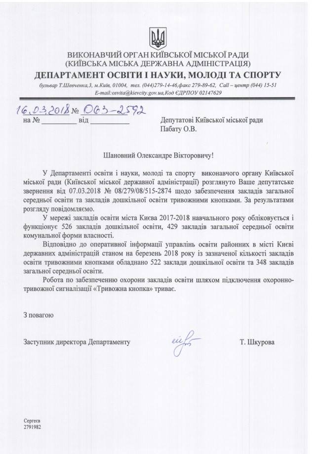 На март 2018 года из 429 школ Киева тревожной кнопкой оборудованы 348. Из 526 детских садов столицы тревожной кнопкой оборудованы 522.