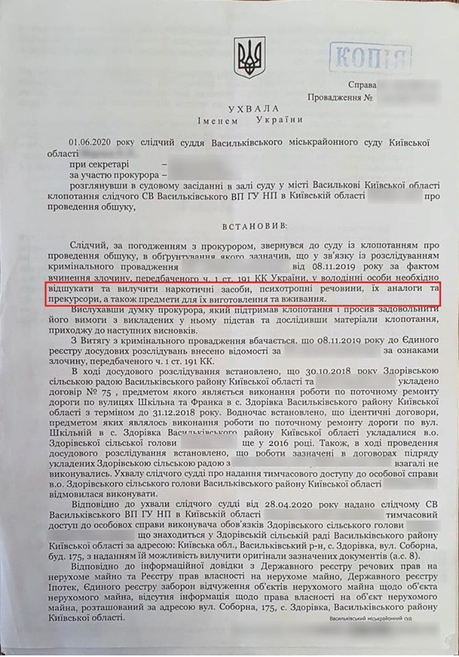 Сотрудники полиции провели обыск в Здоровском сельсовете Васильковского района Киевщины. Согласно определению следственного судьи Васильковского горрайонного суда, правоохранители должны были отыскать и изъять наркотики, а также предметы для их изготовления и употребления.