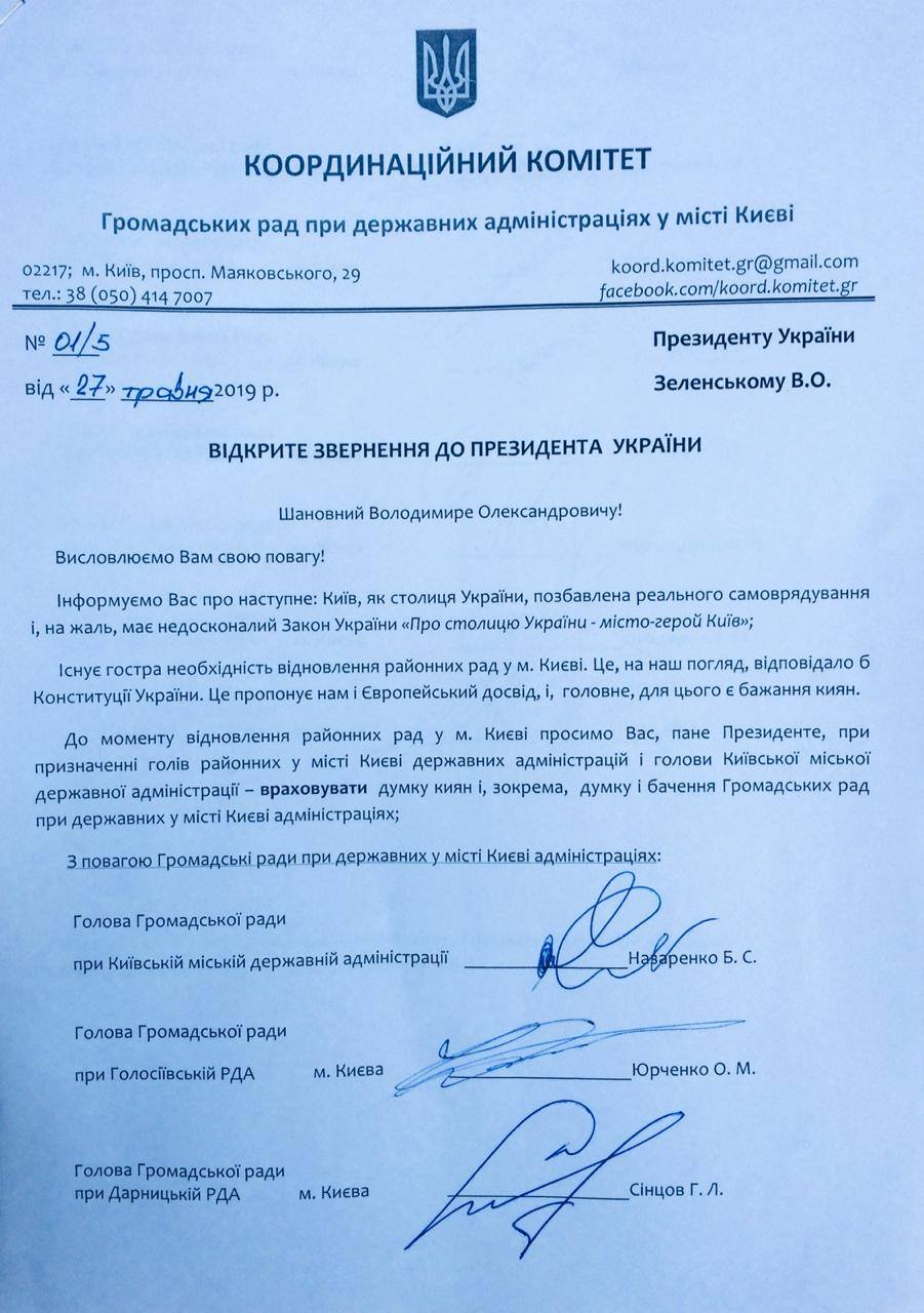 Также Президента настоятельно попросили до восстановления райсоветов при назначении глав РГА и председателя КГГА обязательно учитывать мнение киевлян и общественных советов Киева.