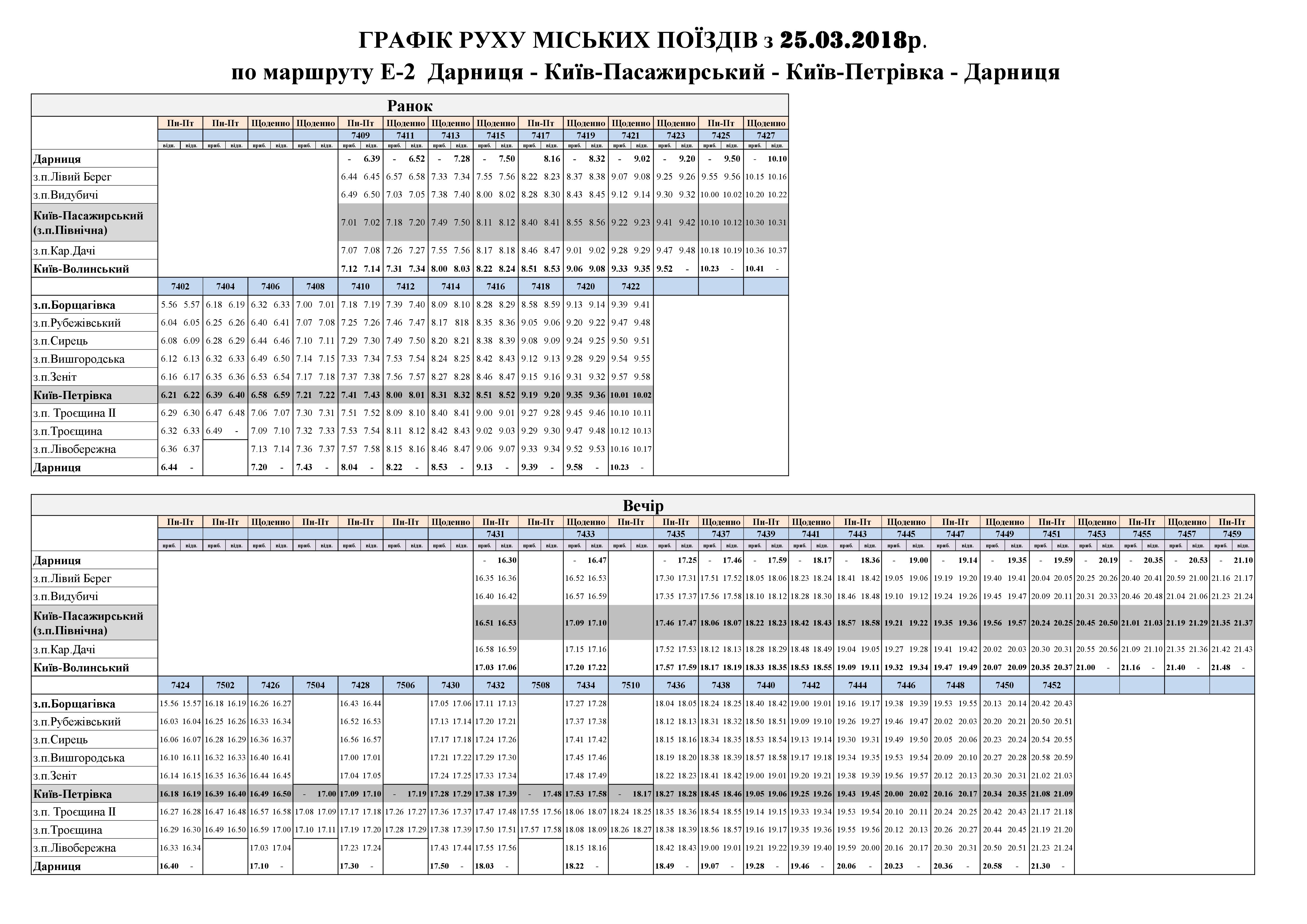 График движения по маршруту E2 Дарница – Киев-Пассажирский – Киев-Петровка – Дарница можно сказать по ссылкам: утро, вечер.