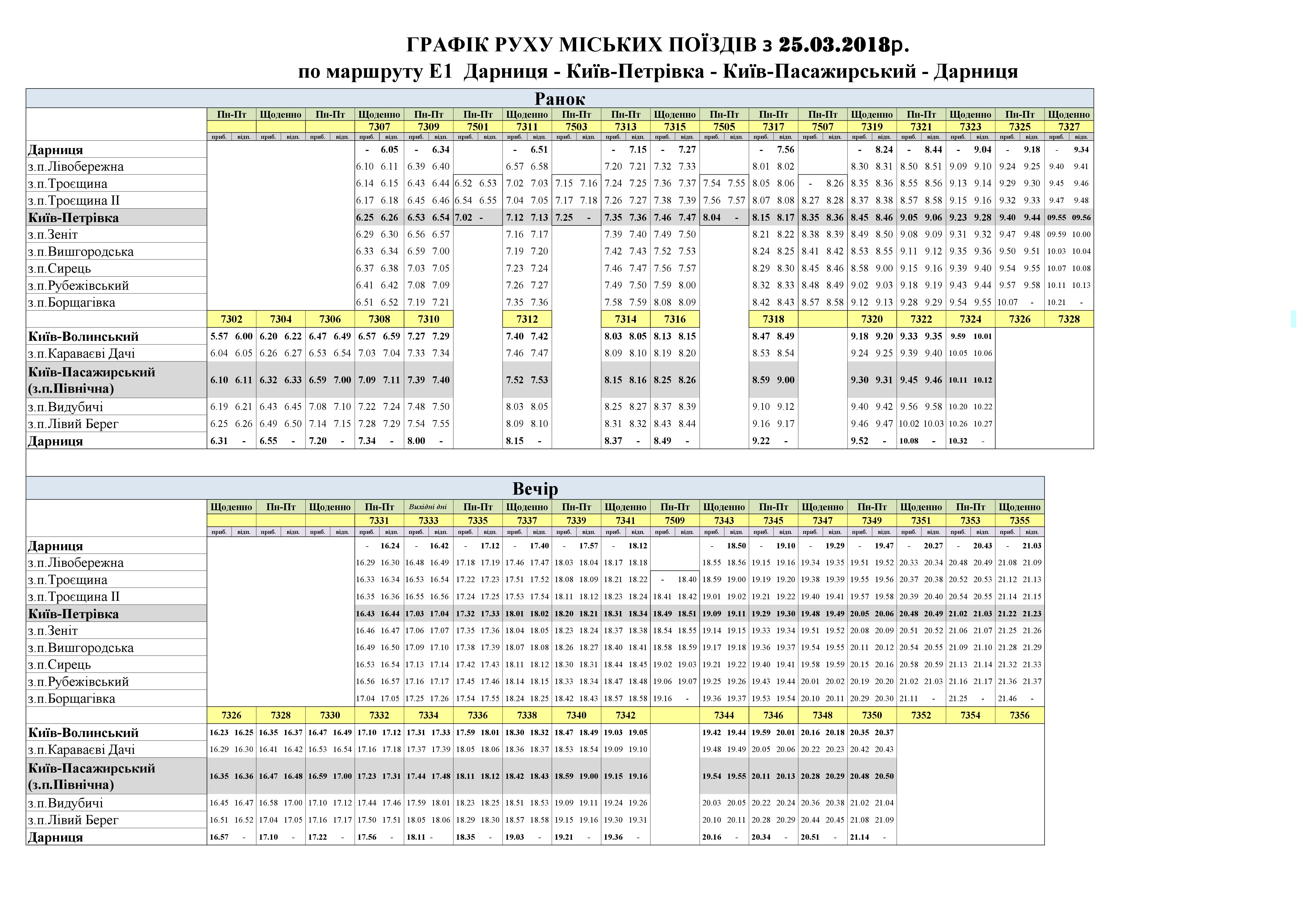 График движения по маршруту E1 Дарница – Киев-Петровка – Киев-Пассажирский – Дарница можно сказать по ссылкам: утро, вечер.