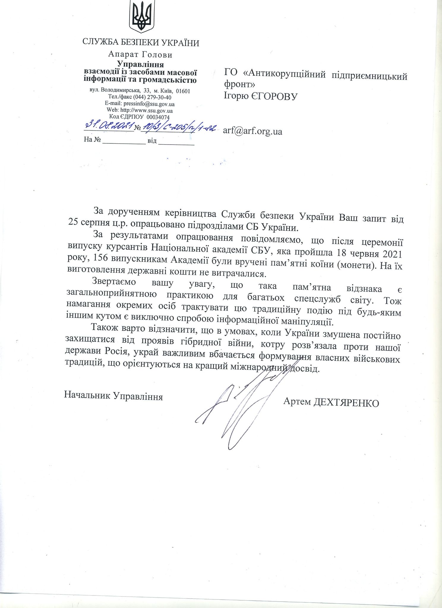 “На запрос об информации к СБУ от 25.08.2021 № 286-ОВ, который содержал вопросы, которые были вызваны вниманием общества и СМИ мы получили ответ от СБУ (…) с неполной информацией по сути вопросов, и с непонятными умозаключениями должностных лиц службы, которые не относятся к вопросам, указанным в запросе. Также ответ СБУ содержал информацию, что на изготовление памятных коинов (монет), которые были вручены выпускникам Национальной Академии СБУ, государственные средства не расходовались, но источник средств не был указан”, – сетуют общественники.