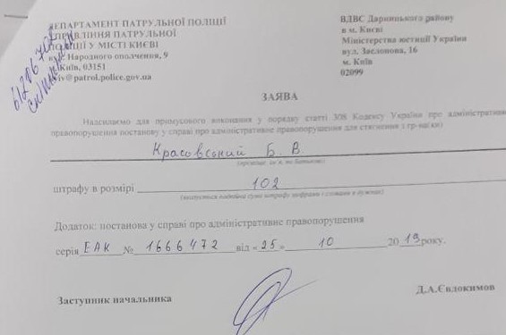 “Юрий Зозуля, почему ваши патрульные составляют фейковые постановления? И зачем вы держите патрульных, которые даже не способны “нормально” сфальсифицировать постановление? Сорри, но подделать мою подпись – может даже инфузория туфелька. Сравните закорючку кого-то из ваших и мою реальную подпись”, – обратился Борис Красовский к руководителю Патрульной полиции Киева Юрию Зозуле.