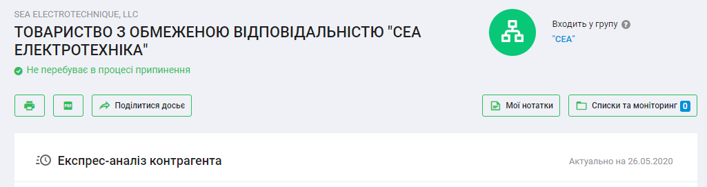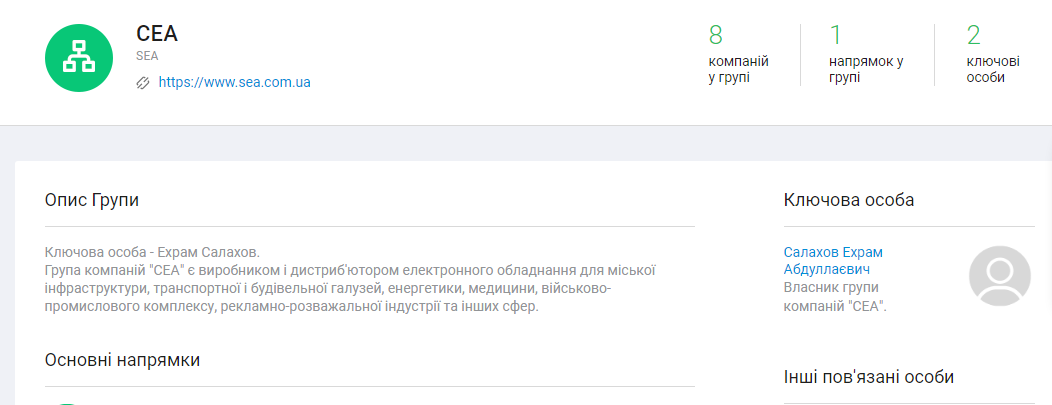 Согласно данным аналитической системы Youcontrol, ООО “СЭА Электротехника” основано в 2012 году. Предприятие возглавляет Иван Ленда. Учредители – Эхрам Салахов (99,03%) и МЧП “СЭА”. Основной вид деятельности – оптовая торговля машинами и оборудованием. Уставный капитал – 310 тыс. гривен.