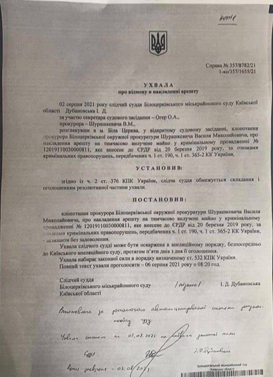 Зазначену інформацію разом з клопотанням накласти арешт на дану будівлю обласна рада передала до Білоцерківської окружної прокуратури. Слідчий суддя Білоцерківського міськрайонного суду Дубановська І.Д. не задовільнила клопотання прокурора Білоцерківської окружної прокуратури та 02.08.2021 року відмовила у накладенні арешту на вказану будівлю, цим самим даючи можливість відчужити будівлю третім особам.
