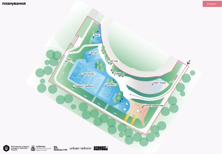 Активний парк у Макарові поєднає ці запити. Тут облаштують мультикорт для волейболу, бадмінтону, стрит-футболу та баскетболу, бетонний парк для скейтборду, BMX, самокатів і роликів, майданчики для воркауту, стритболу й настільного тенісу. Передбачено й простір для йоги, дитячий майданчик, зону тихих ігор зі стаціонарними шаховими дошками, а також стежки з місцями для відпочинку та зелені схили з трибунами.
