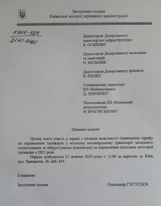 За його словами, сьогодні у Київській міській адміністрації дійсно відбулася нарада щодо обґрунтування компенсації за перевезення пільгових категорій громадян у 2021 році. Оригінал документу за номером № 008-987 від 21.10.2020 додається.