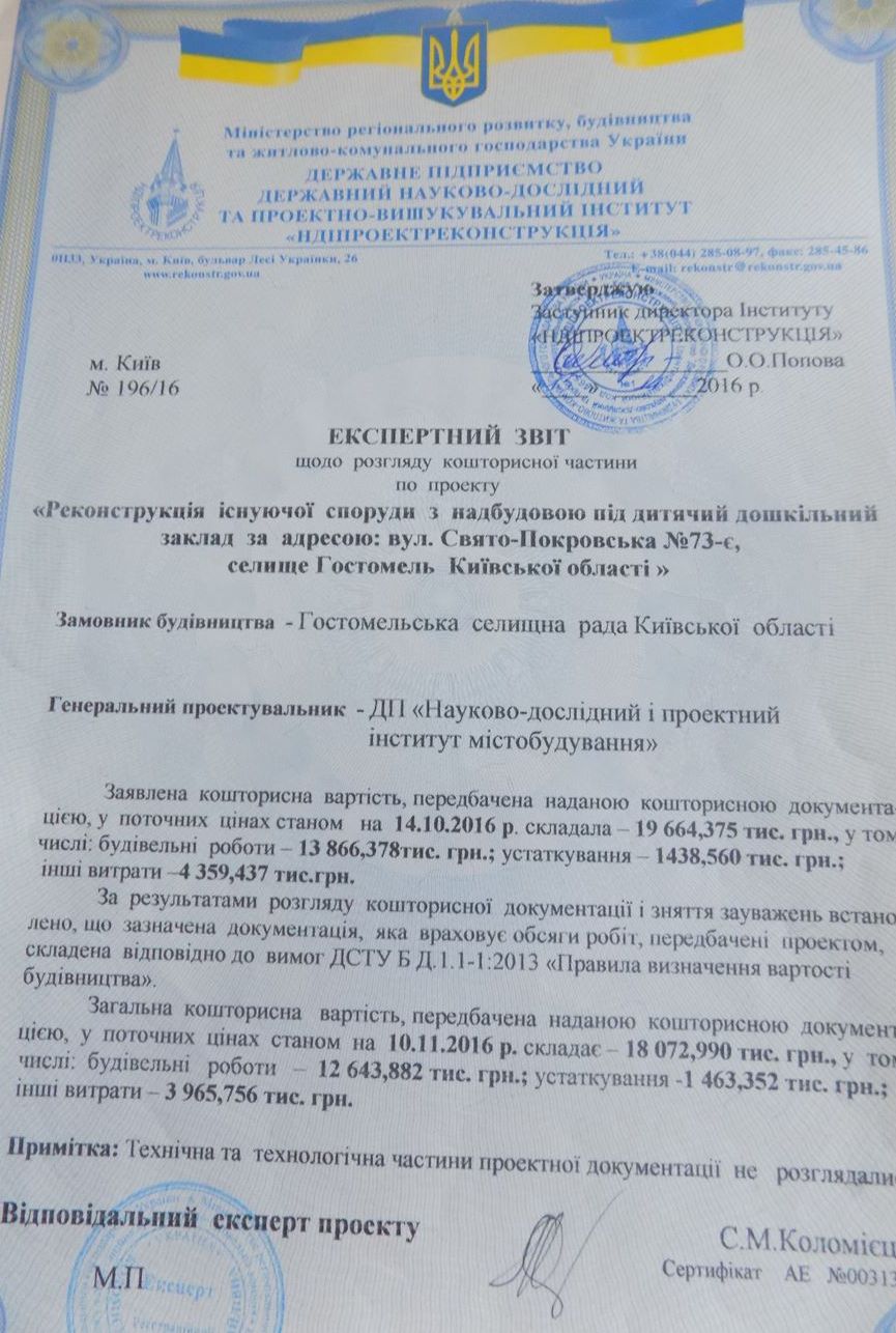 У 2016 році затверджено експертний звіт Державного науково-дослідного та проектно-вишукувального інституту “НДІпроектреконструкція” щодо реконструкції існуючої споруди під дитячий дошкільний заклад. Згідно з документом, загальна кошторисна вартість робіт в цінах на листопад 2016 року становила 18,07 млн гривень.