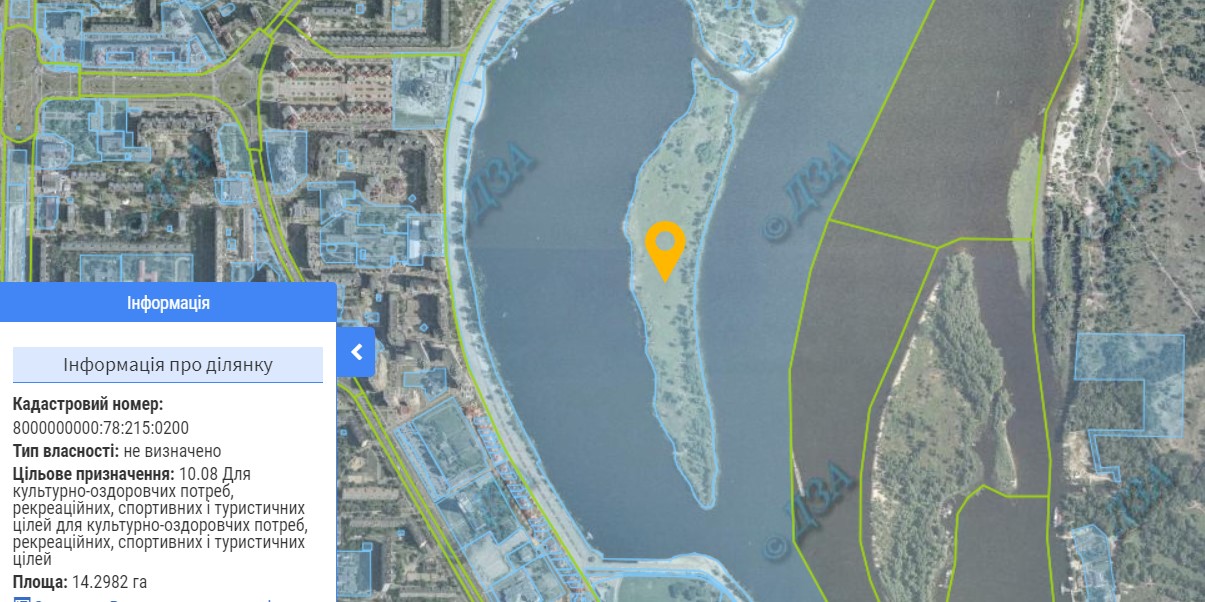 • участок, площадью 14,29 га (кадастровый номер 8000000000:78:215:0200, остров Оболонский). Целевое назначение – для культурно-оздоровительных потребностей, рекреационных, спортивных и туристических целей. Функциональное назначение – территория зеленых насаждений общего пользования.