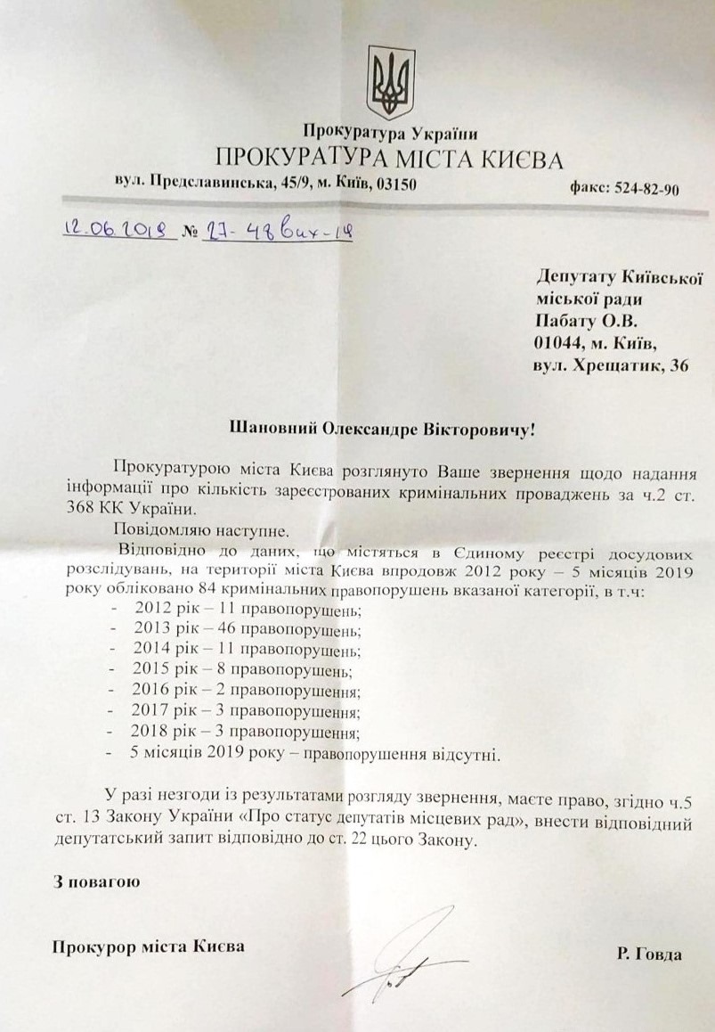 Депутат также опубликовал в сообщении ответ прокуратуры Киева на его обращение, в котором указано, что за период с 2012 года по июнь 2019 года в Едином реестре досудебных расследований на территории Киева зарегистрировано 84 криминальных правонарушений по статье о взятках в особо крупных размерах. При этом рекордсменом по количеству зарегистрированных правонарушений такого типа является 2013 год (43 правонарушения). После 2013 года количество регистрируемых правонарушений о взятках в особо крупных размерах резко пошло на спад. Уже в 2014 году было зарегистрировано всего 11 таких правонарушений. В 2015 – 8 правонарушений, в 2016 – 2, в 2017 и в 2018 годах было зарегистрировано по 3 правонарушения о взятках в особо крупных размерах.