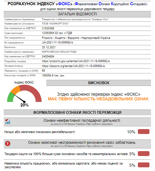 Громадська антикорупційна експертиза результатів державних тендерів “Антикорупційний монітор” виділяє декілька незадовільних ознак, які властиві, на їх думку, ТОВ “Комфорт-Еко”. Зокрема, низькі або негативні показники рентабельності та те, що тендерні кошти на 100% більше суми основних засобів та нематеріальних активів.