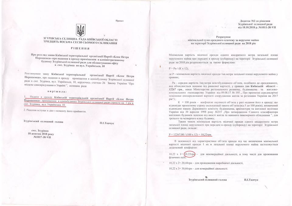 Как стало известно KV, решением Згуровского поселкового совета №1017-38-VII от 18.10.2018 года Киевская территориальная организация партии “Блок Петра Порошенко” получила в аренду помещение в админздании Згуровского поселкового совета сроком на 1 год.