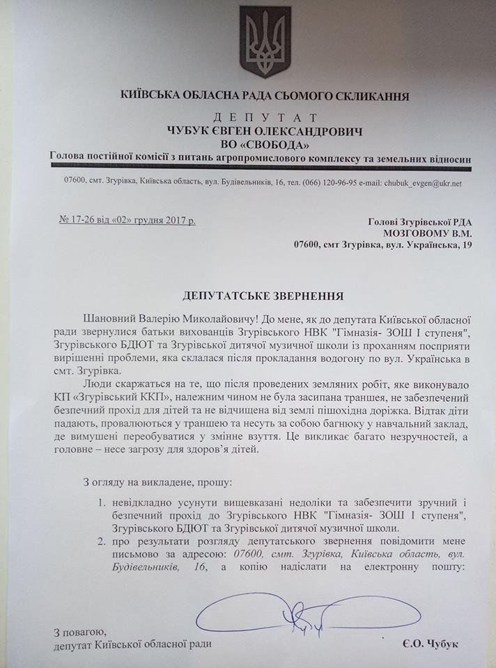 Чубук рассказал, что родители воспитанников Згуровского УВК “Гимназия – ООШ I степени”, Згуровского ДДЮТ и Згуровской детской музыкальной школы просят его помочь в решении проблемы, которая сложилась после прокладки водопровода по ул. Украинской в поселке Згуровка.