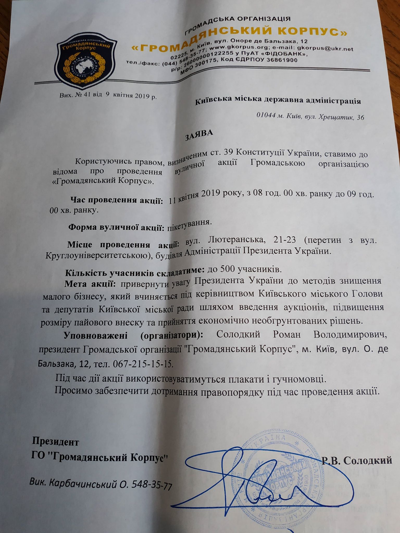 Как указано в заявлениях о проведении митинга, участники акции хотят “привлечь внимание Президента к методам уничтожения малого бизнеса, который осуществляется под руководством Киевского городского головы и депутатов Киевсовета путем введения аукционов, повышения паевого взноса и принятия экономически необоснованных решений”.