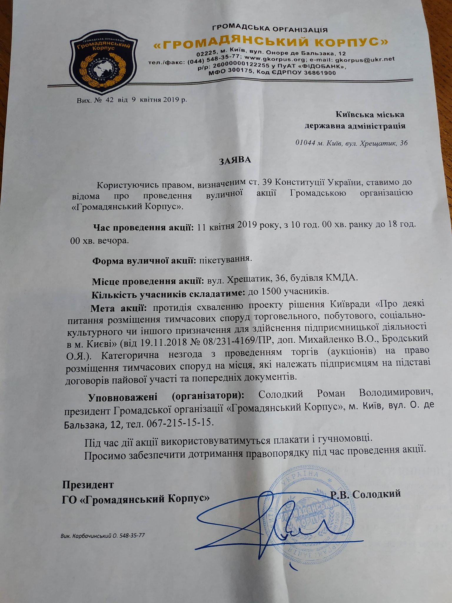 Об этом KV стало известно из заявлений (1, 2) о проведении акции, направленных в Киевскую горгосадминистрацию (КГГА).