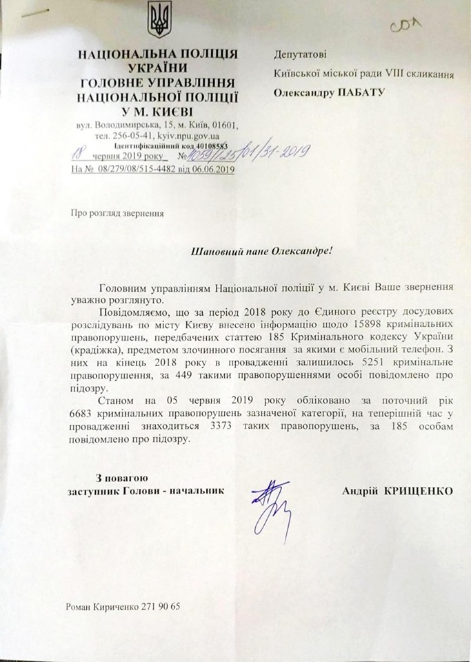 Как указано в ответе ГУ Нацполиции в Киеве на обращение Александра Пабата, в 2018 году в столице было зарегистрировано 15 898 случаев краж мобильных телефонов. Из них на конец 2018 года в производстве остались 5 251 дело, а о подозрении сообщено 449 лицам.