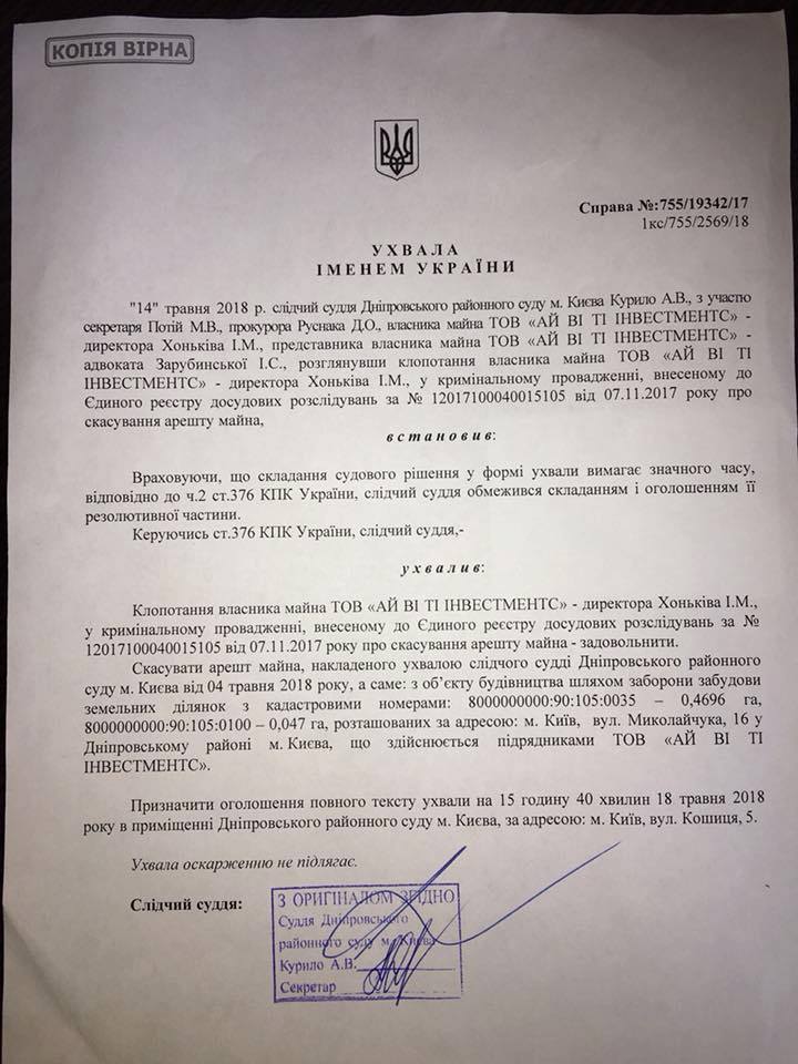 Директор владельца имущества – компании ООО “Ай ви ти инвестментс” – Игорь Хонькив обратился с ходатайством в уголовном производстве, внесенном в ЕРДР 7 ноября 2017 года под № 12017100040015105.