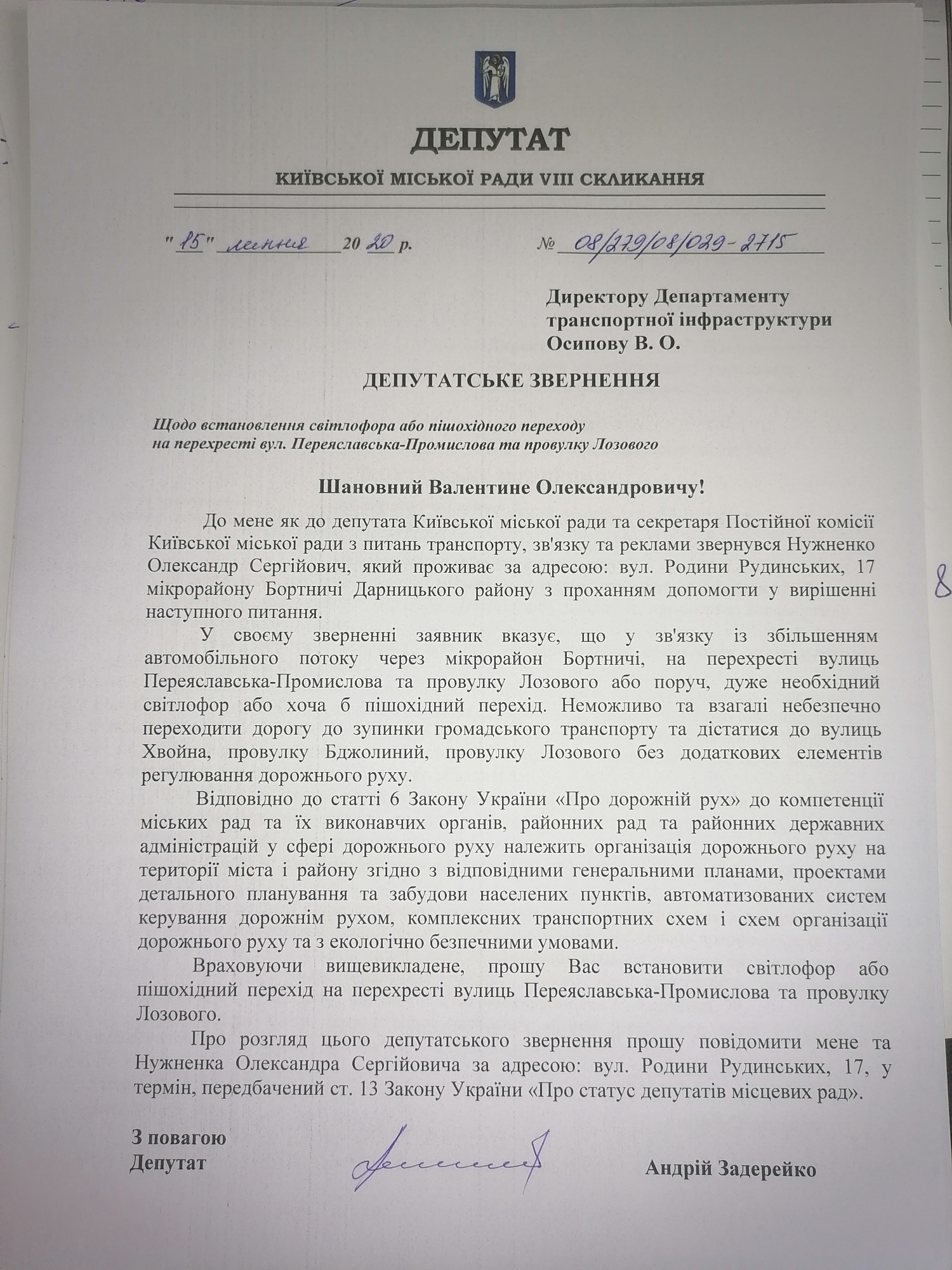 Андрей Задерейко попросил директора Департамента транспортной инфраструктуры КГГА установить светофор или пешеходный переход на перекрестке улиц Переяславская-Промышленная и переулка Лозового.