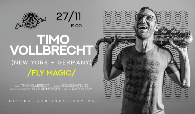 В субботу, 27 ноября, в Caribbean Club Concert Hall состоится концерт немецкого саксофониста Тимо Фольбрехта и его джаз-квартета “Fly Magic”. Начало в 19:00. Билеты: от 350 грн.