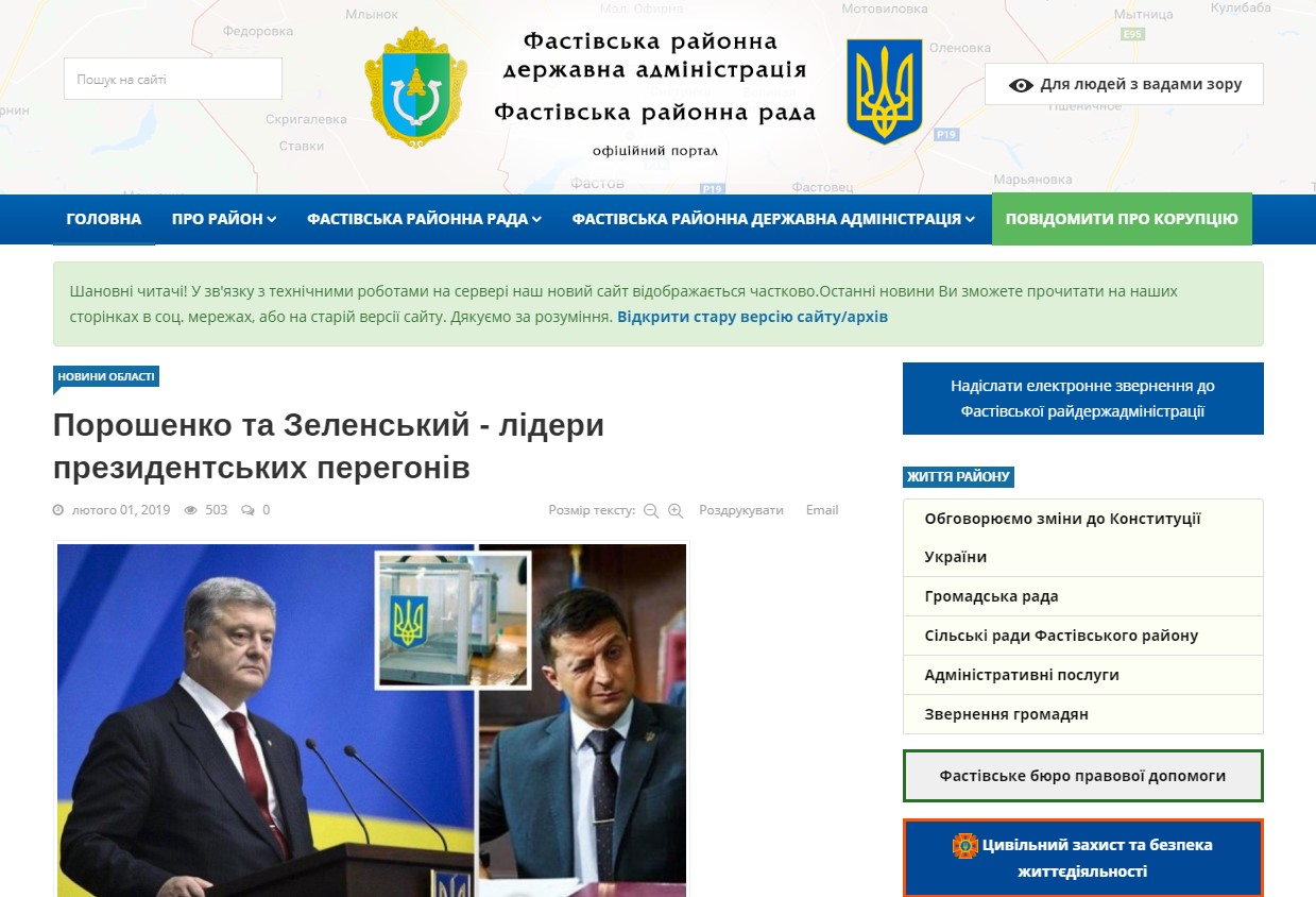 Как стало известно KV, на сайте Фастовской районной госадминистрации (РГА) и райсовета 1 февраля в разделе новостей одновременно появились публикации о результатах соцопроса, проведенного в рамках грядущих выборов Президента Украины в марте 2019 года.