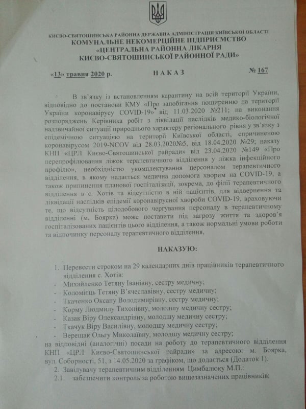 Причина обох указів аналогічна – він є результатом виконанням постанови КМУ “Про запобігання поширенню на території України коронавірусу COVID-19”, розпоряждень керівника робіт з ліквідації наслідків медико-біологічної надзвичайної ситуації природного характеру регіонального рівня у зв’язку з епідемічною ситуацією у Київській області, наказу Києво-Святошинської ЦРЛ “Про перепрофілювання ліжок терапевтичного відділення у ліжка інфекційного профілю”. Та інші причини – необхідність укомплектування персоналом терапевтичного відділення, де приймають хворих на коронавірус, а також припинення планової госпіталізації та відсутність пацієнтів у філії Хотова.