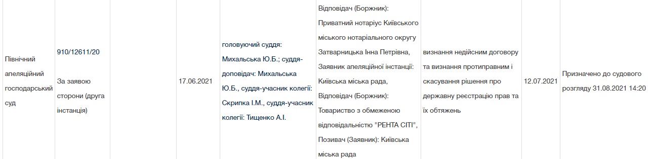 8 апреля 2021 года Хозяйственный суд Киевской области полностью отказал Киевсовету в удовлетворении его требований. 12 мая 2021 года горсовет подал апелляционную жалобу на такое решение суда первой инстанции. 12 июля 2021 года Северный апелляционный хозяйственный суд открыл апелляционное производство и назначил ближайшее заседание на указанную выше дату.