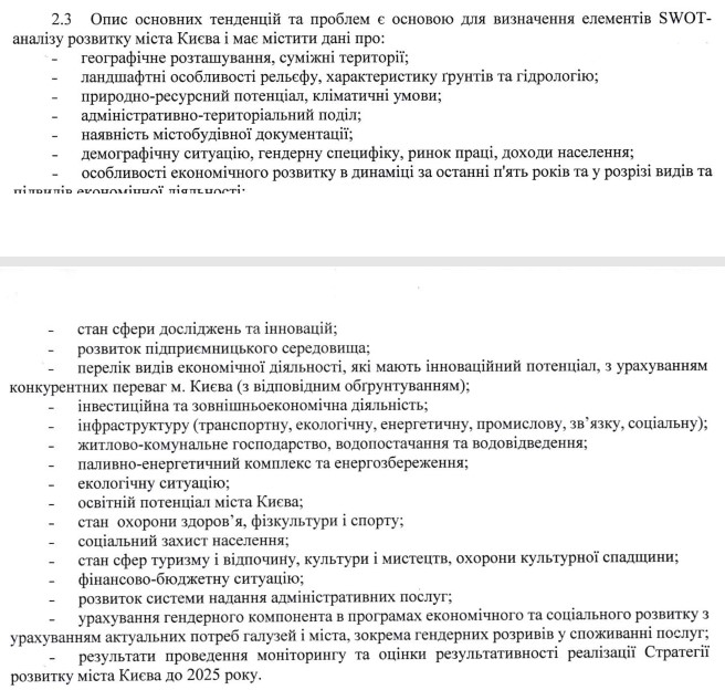 Описание подрядчиком основных тенденций и проблем Киева должно охватить все сферы жизнедеятельности столицы, начиная от географического расположения и особенностей рельефа, заканчивая демографической ситуацией, особенностями экономического развития и развитием системы предоставления услуг. А также содержать результаты проведения мониторинга и оценки результативности реализации Стратегии развития города Киева до 2025 года.