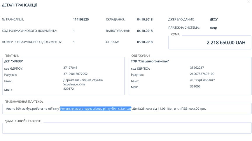 В октябре прошлого года ГСП УКСЗО оплатило компании “Спецэнергомонтаж Киев” аванс в размере 30% от суммы работ, который составил 2 млн 218 тыс. 650 гривен.