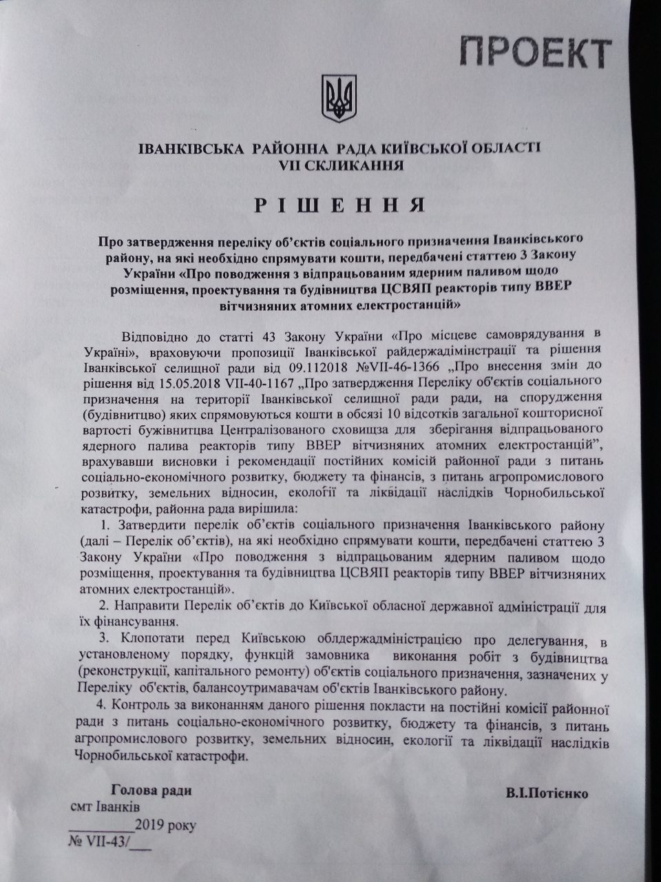 Как стало известно KV, 20 февраля депутаты Иванковского райсовета провалили проект решения “Об определении приоритетности финансирования объектов социального назначения Иванковского района, на которые должны быть направлены средства, предусмотренные ст. 3 ЗУ “Об обращении с отработанным ядерным топливом относительно размещения, проектирования и строительства ЦХОЯТ реакторов типа ВВЭР отечественных атомных электростанций”, инициированный депутатом Иванковского райсовета Олегом Береговым (ВО “Свобода”).