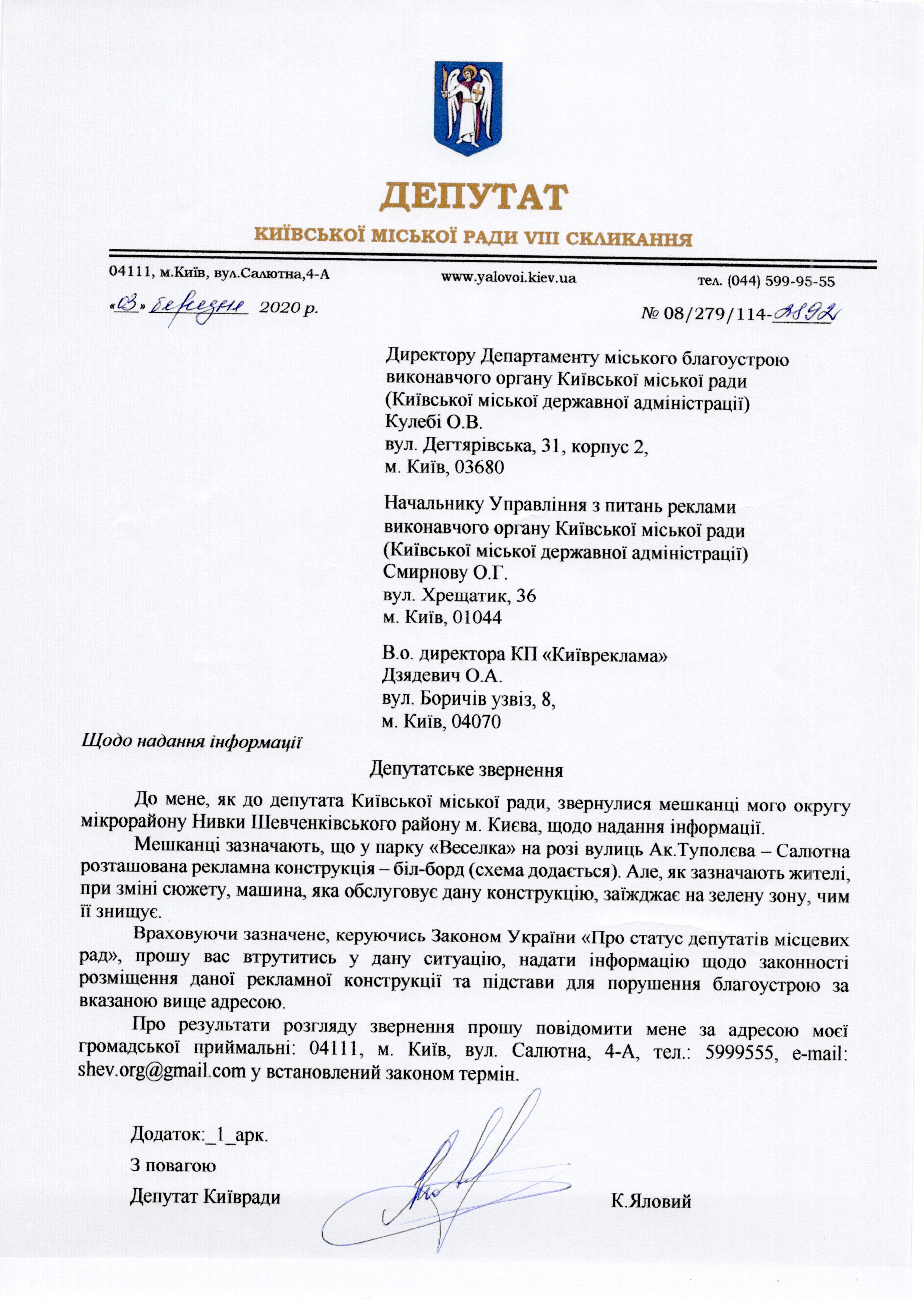 Глава постоянной комиссии Киевсовета по вопросам экологической политики Константин Яловой (фракция “Единство”) попросил директора Департамента городского благоустройства КГГА Алексея Кулебу, начальника Управления по вопросам рекламы Александра Смирнова и и.о. директора КП “Киевреклама” Оксану Дзядевич разобраться с законностью размещения рекламной конструкции на углу ул. Туполева и Салютной возле парка “Веселка” на столичных Нивках.