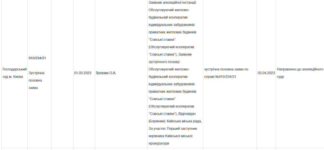 Як стало відомо KВ, на початку квітня 2023 року Обслуговуючий житлово-будівельний кооператив індивідуальних забудовників приватних житлових будинків (ЖБК) “Совські ставки” направив до Північного апеляційного господарського суду апеляційну скаргу по справі №910/234/21.