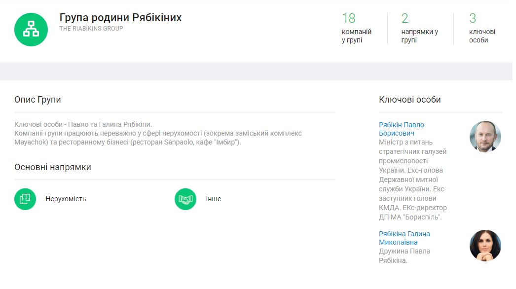 До “групи родини Рябікіна” входить близько двох десятків компаній, які працюють переважно у сфері нерухомості та ресторанного бізнесу. Головними активами цієї групи є вищезгаданий комплекс “Маячок” (включає в себе, серед іншого, яхт-клуб і ресторан), а також ресторан “Sanpaolo” і кафе “Імбир”. Ключові особи – Павло Рябікін та його дружина Галина Рябікіна.