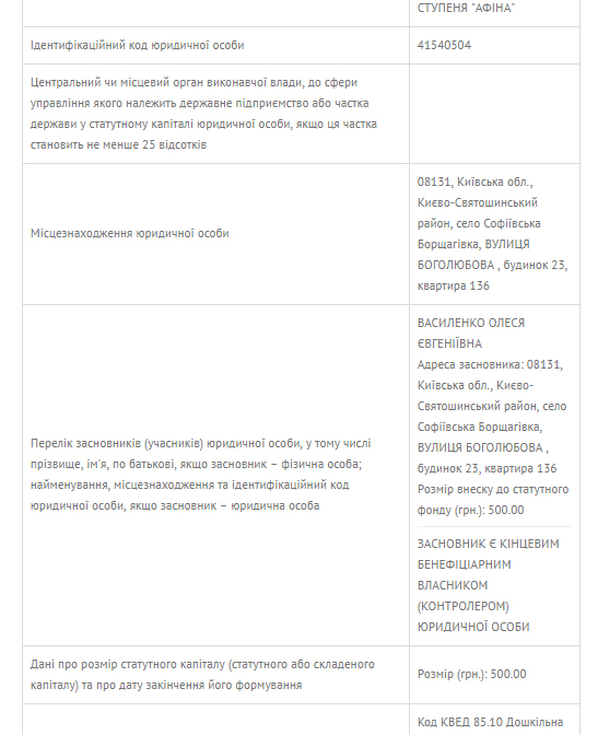 Учредителем частной школы “Афина” является согласно данным ЕГР Василенко Олеся Евгеньевна, уставной фонд предприятия составляет 500 гривен.
